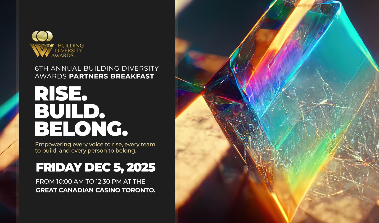 We invite you to the Building Diversity Awards Breakfast Reception. Space is limited. We are offering one complimentary ticket per organization. Email rpowell@communitybenefits.ca to confirm your attendance by Friday, Nov 28. Purchase additional tickets here.